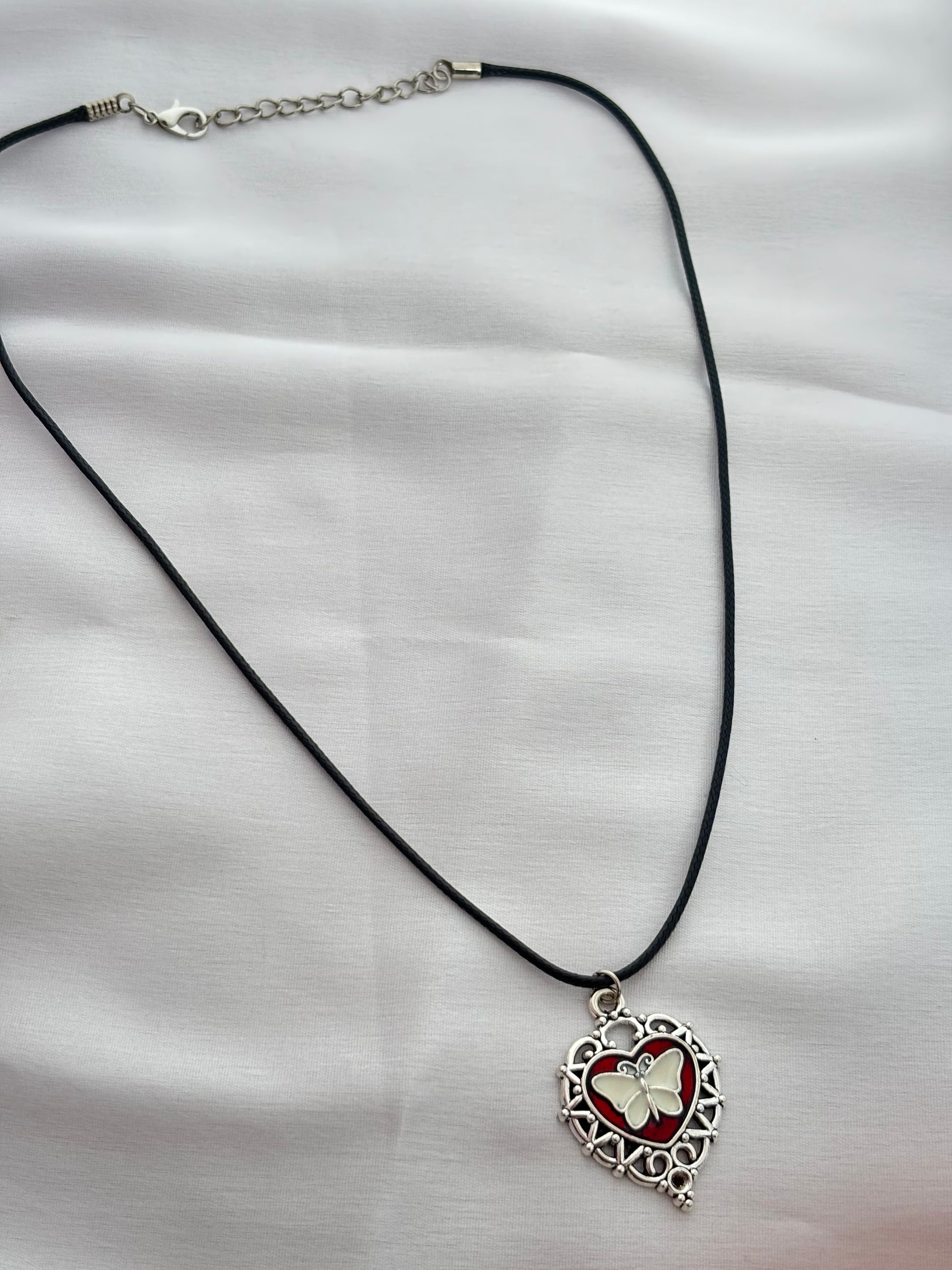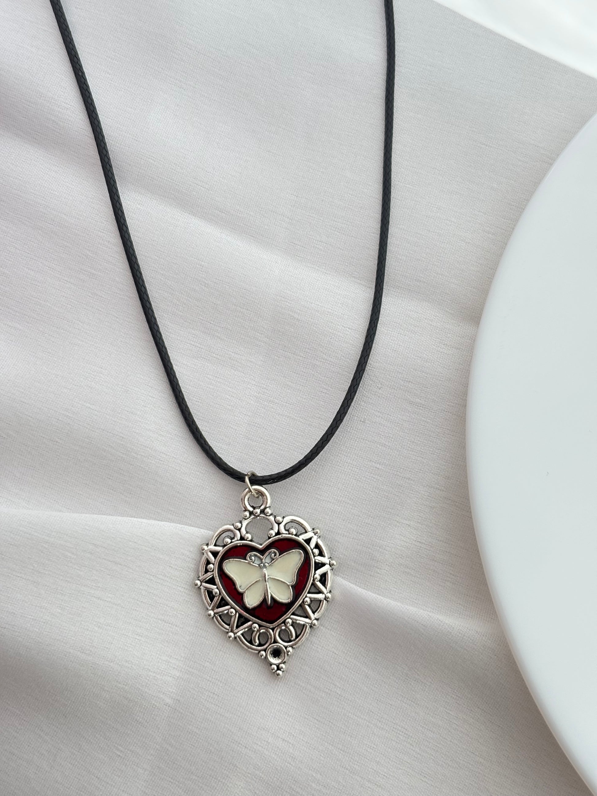 Embrace dark romance with our gothic-style cord necklace. Featuring a vintage silver heart pendant with a striking white butterfly against a deep red background. Perfect for adding a touch of unique, dark elegance to any outfit.