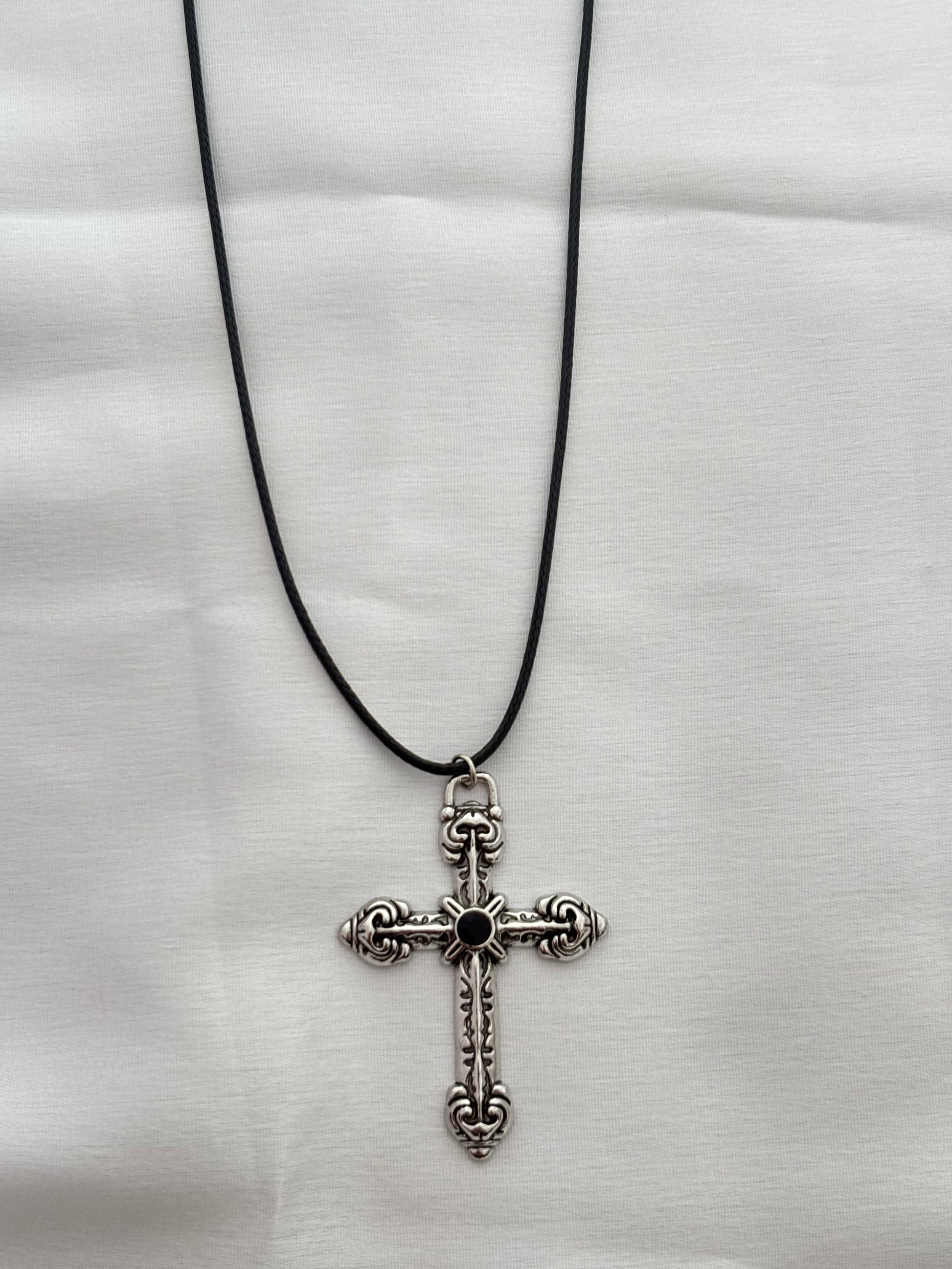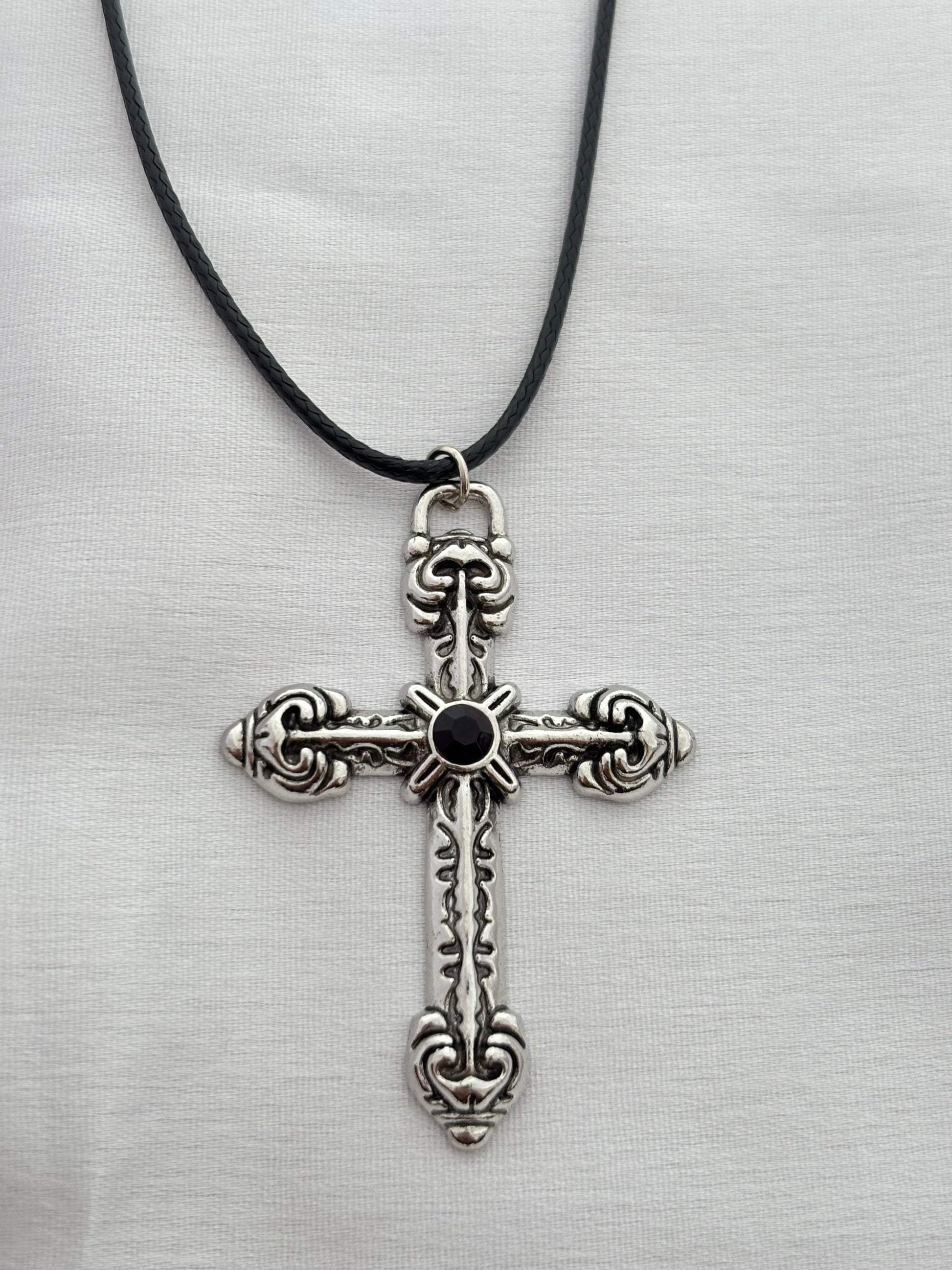 Embrace gothic elegance with this vintage-style silver cross necklace. The ornate, detailed pendant is a bold statement piece, featuring a central black gem and suspended from a durable black cord. Perfect for a striking, yet classic look.
