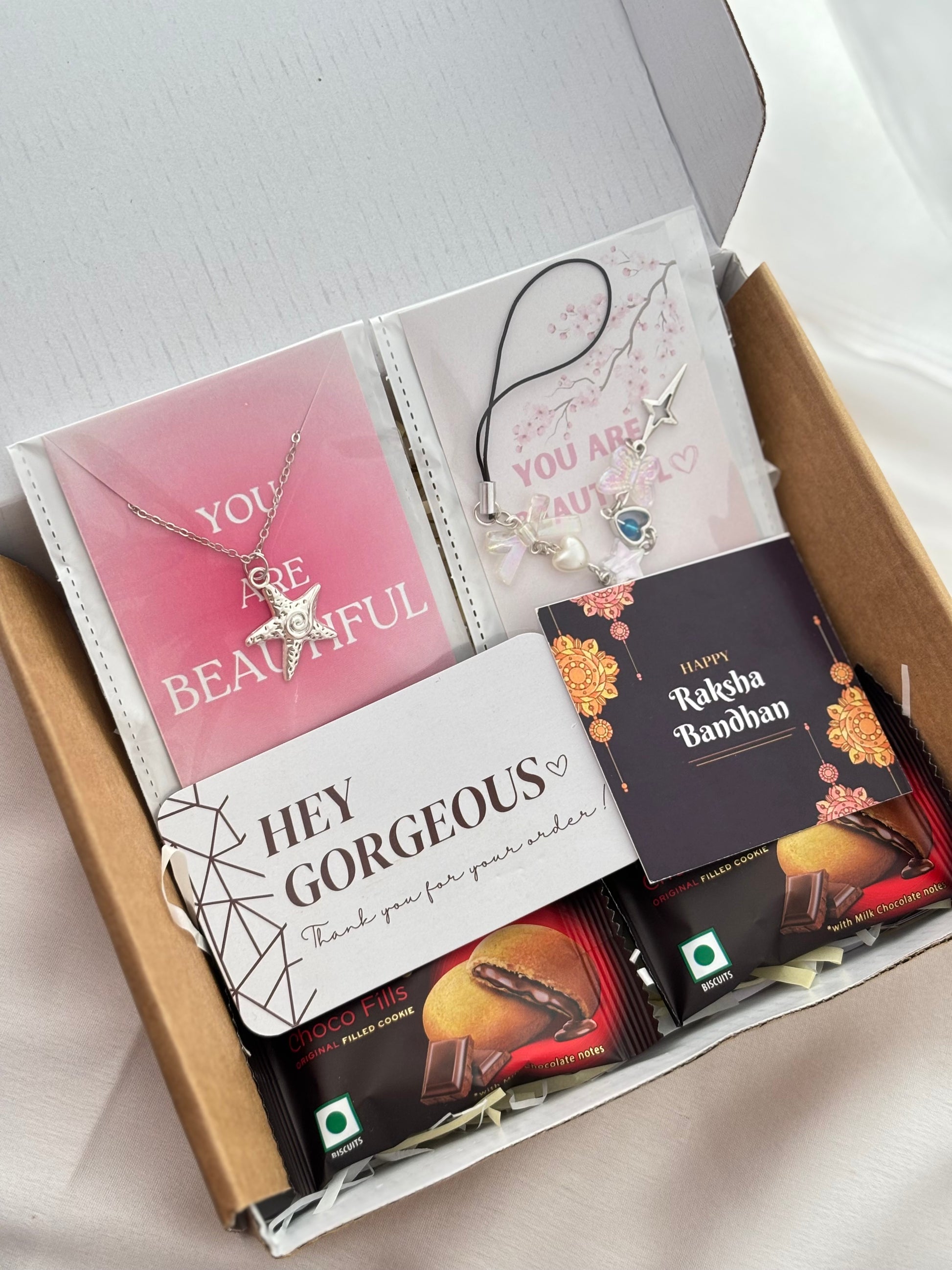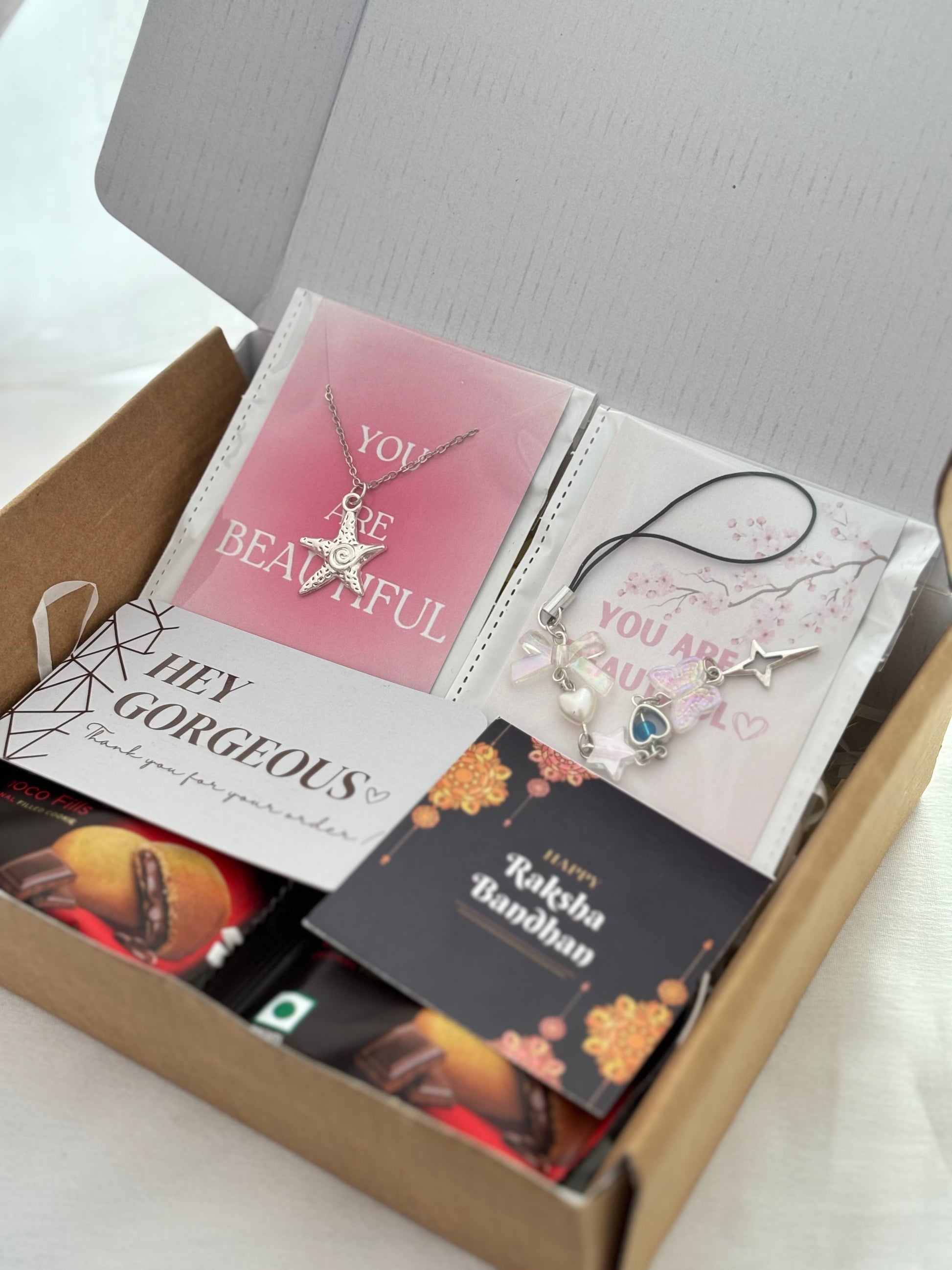 Celebrate Raksha Bandhan with our Mini Rakhi Hampers! Each hamper includes a beautiful necklace and phone charm for your sister, along with a heartfelt Raksha Bandhan card and indulgent dark fantasy cookies. Show your love and appreciation in the most thoughtful way.