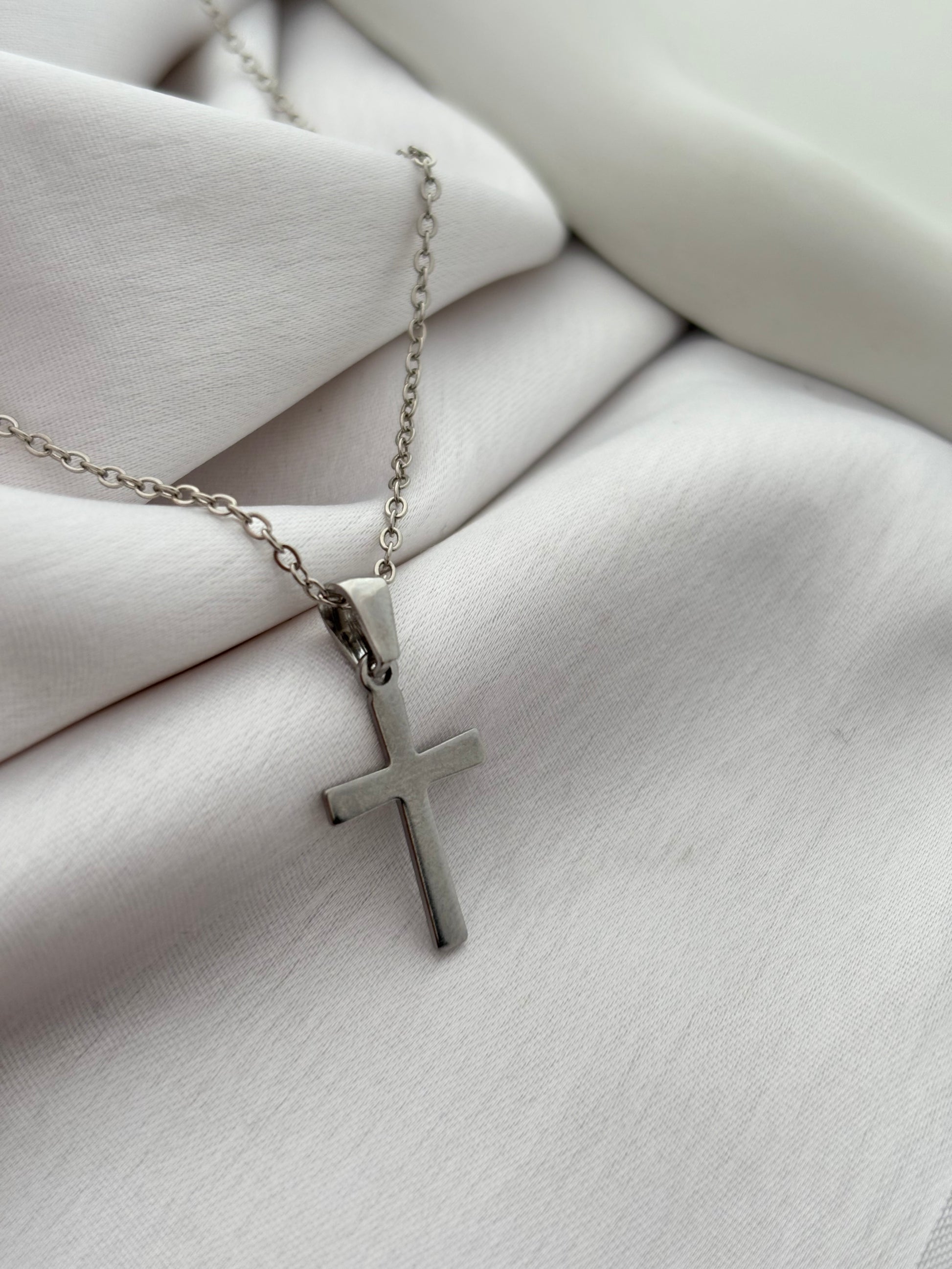 Shop our elegant minimalist cross necklace. Featuring a sleek, polished silver pendant on a delicate chain. Perfect for everyday wear and layering.