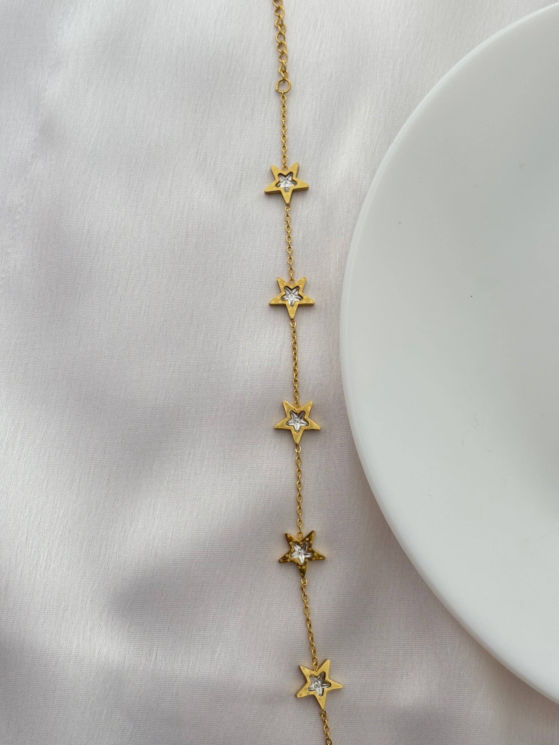 Elevate your accessory collection with the Stellar Charm Bracelet, crafted from anti-tarnish stainless steel to ensure lasting shine and durability. Its water-resistant design keeps your little galaxy safe through daily wear, while the subtle gold finish adds a refined glow. This bracelet offers both elegance and resilience, making it a perfect choice for those who appreciate timeless style with practical quality.